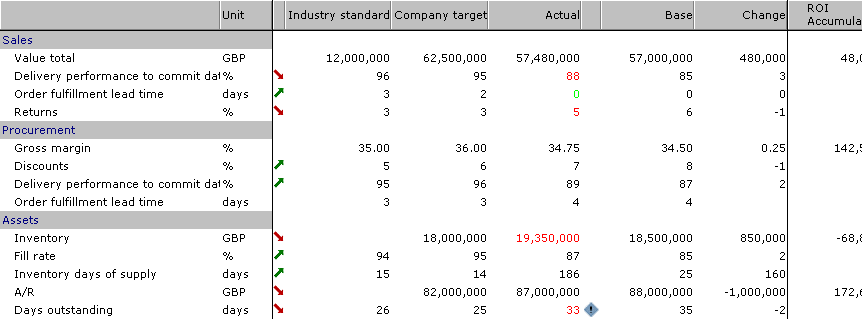 The solution to being able to project any kind of pay-off, are components (i.e. Key performance indicators). These can help explain the changes that have taken place over any time period. Such questions for which you want answers could be: “Are service levels and fill rates improved?” “Did inventory turnover increase?” “Did we save any outstanding days in A/R?”